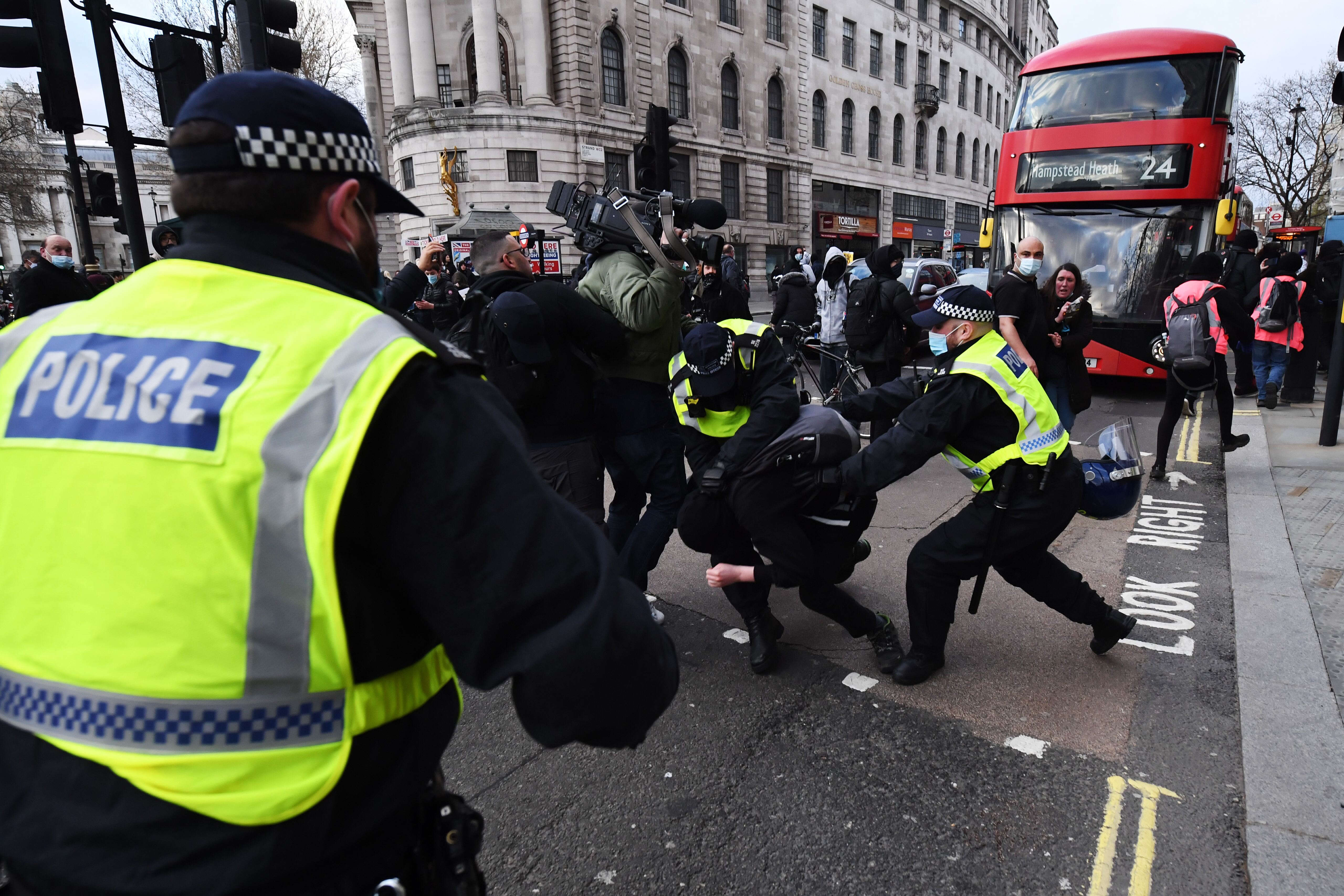 London's Metropolitan Police said the majority of people "have tried to adhere to social distancing" but that a "small minority" had blocked the road at Parliament Square.