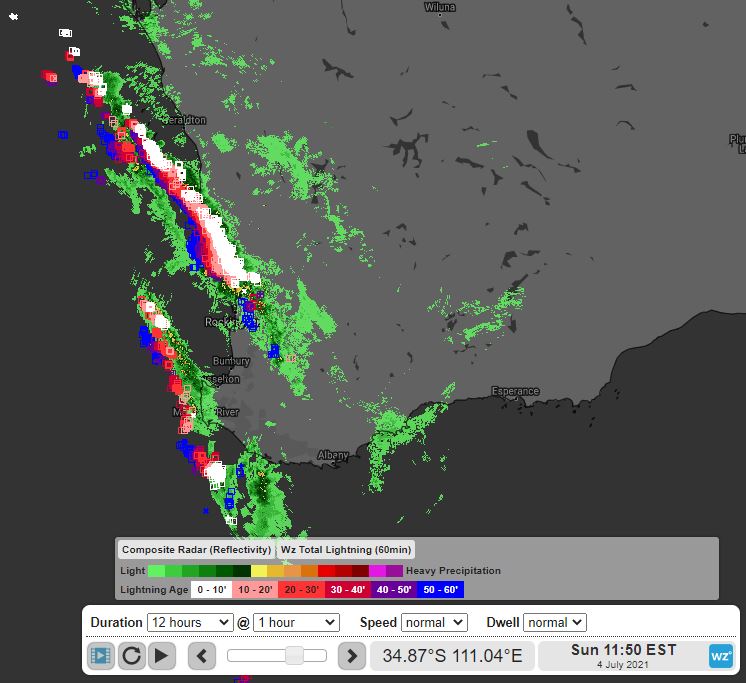 The front started to sweep across southwest WA on yesterday afternoon bringing gusty winds, showers and storms.