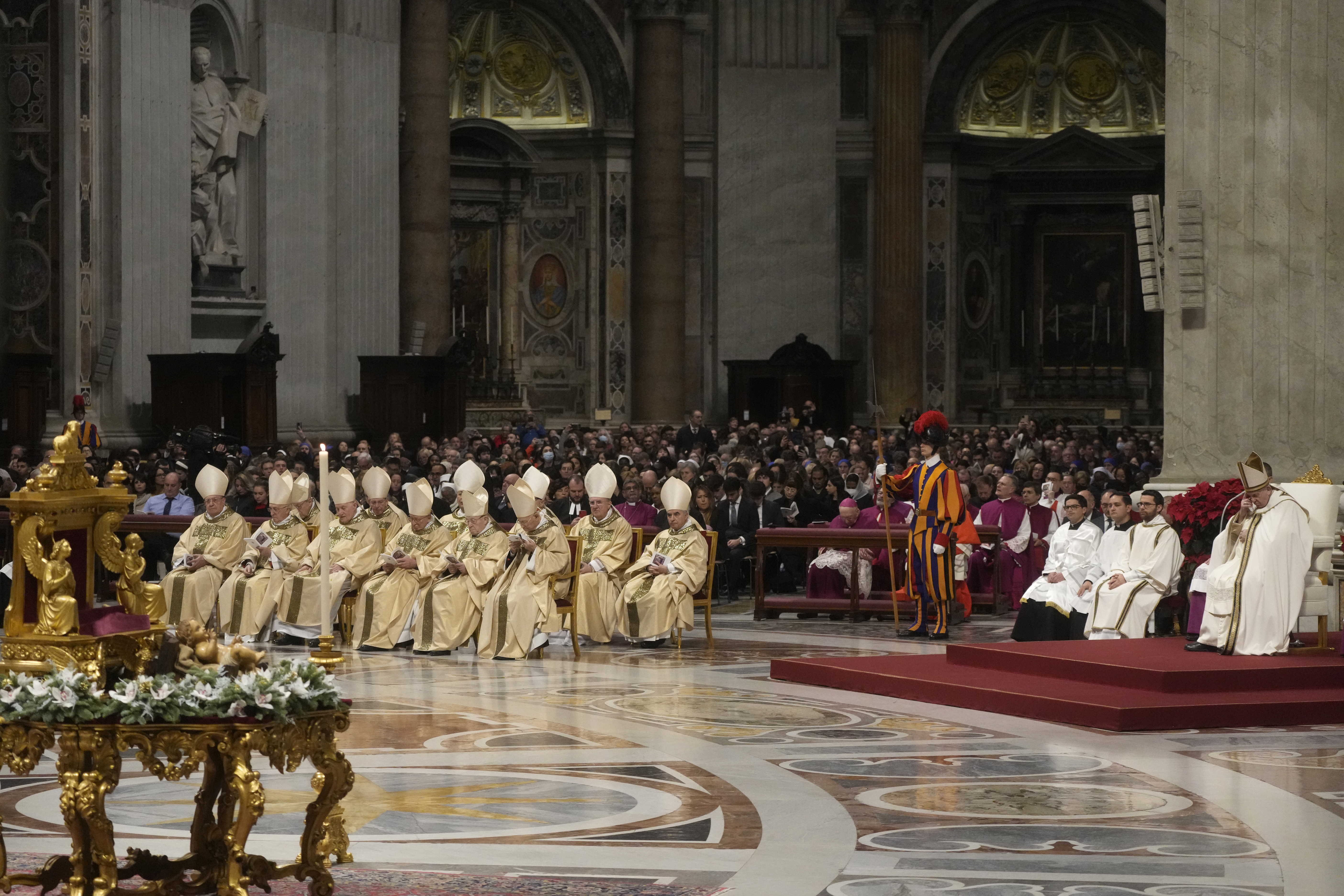 In the splendor of St Peter's Basilica, Francis presided over the evening Mass attended by about 7000 faithful, including tourists and pilgrims, who flocked to the church on a warm evening and took their place behind rows of white-robed pontiffs.