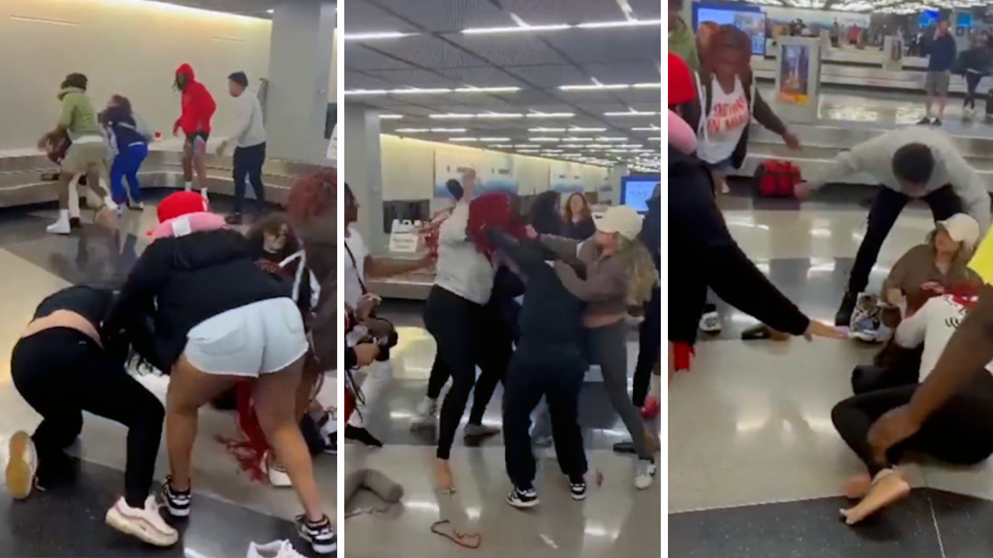 The moment a 10-person brawl erupted at a US airport has been captured on video, depicting a group throwing punches at one another as others wrestle on the ground.
