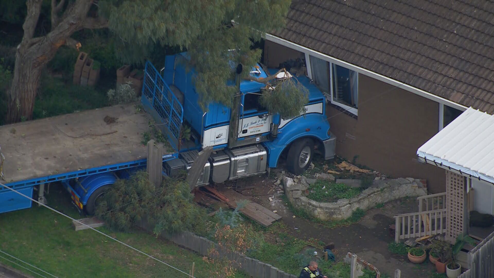 The truck, which wasn't carrying a load at the time, crossed a nature strip and narrowly missed a large tree before smashing into the front wall of the corner block home.