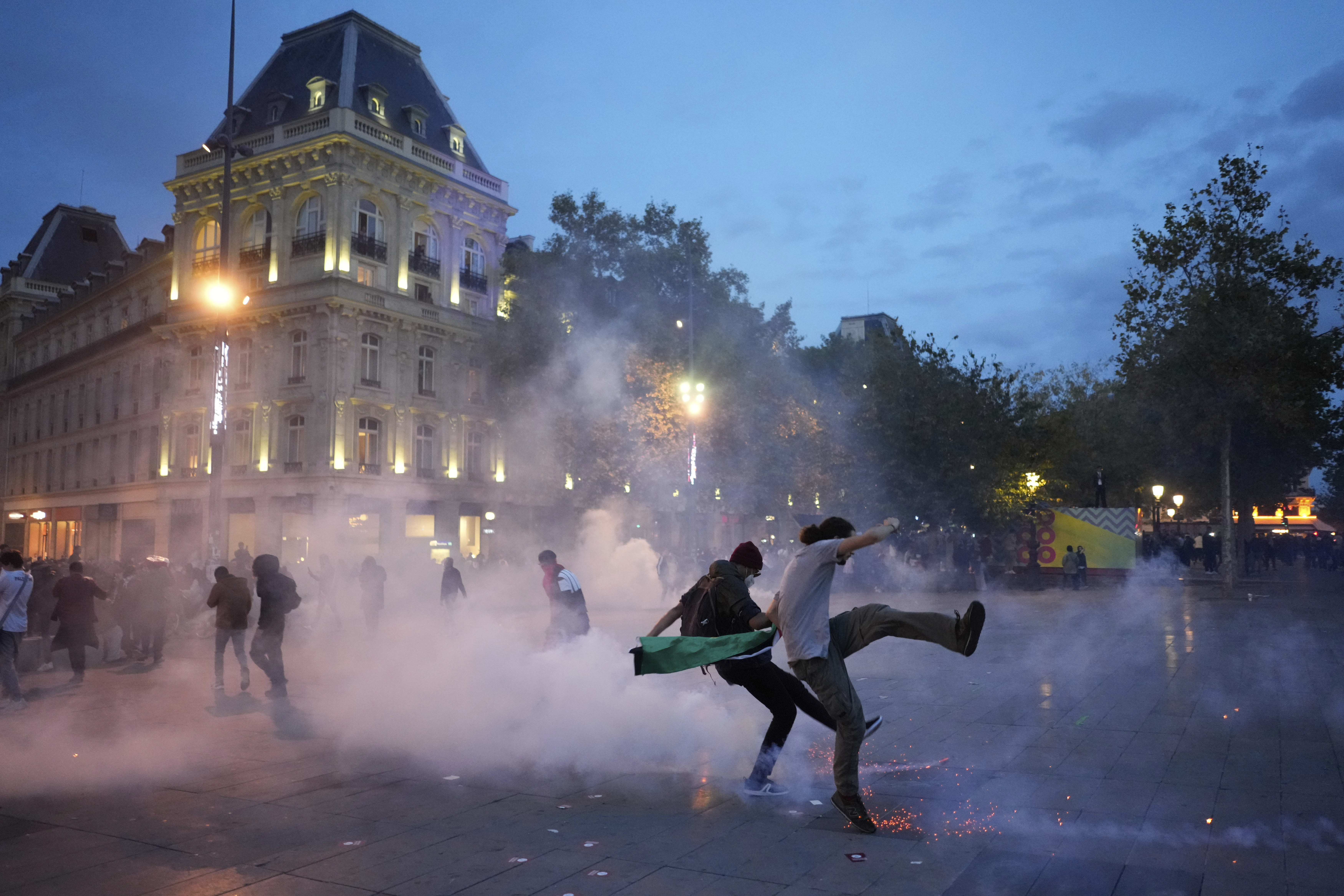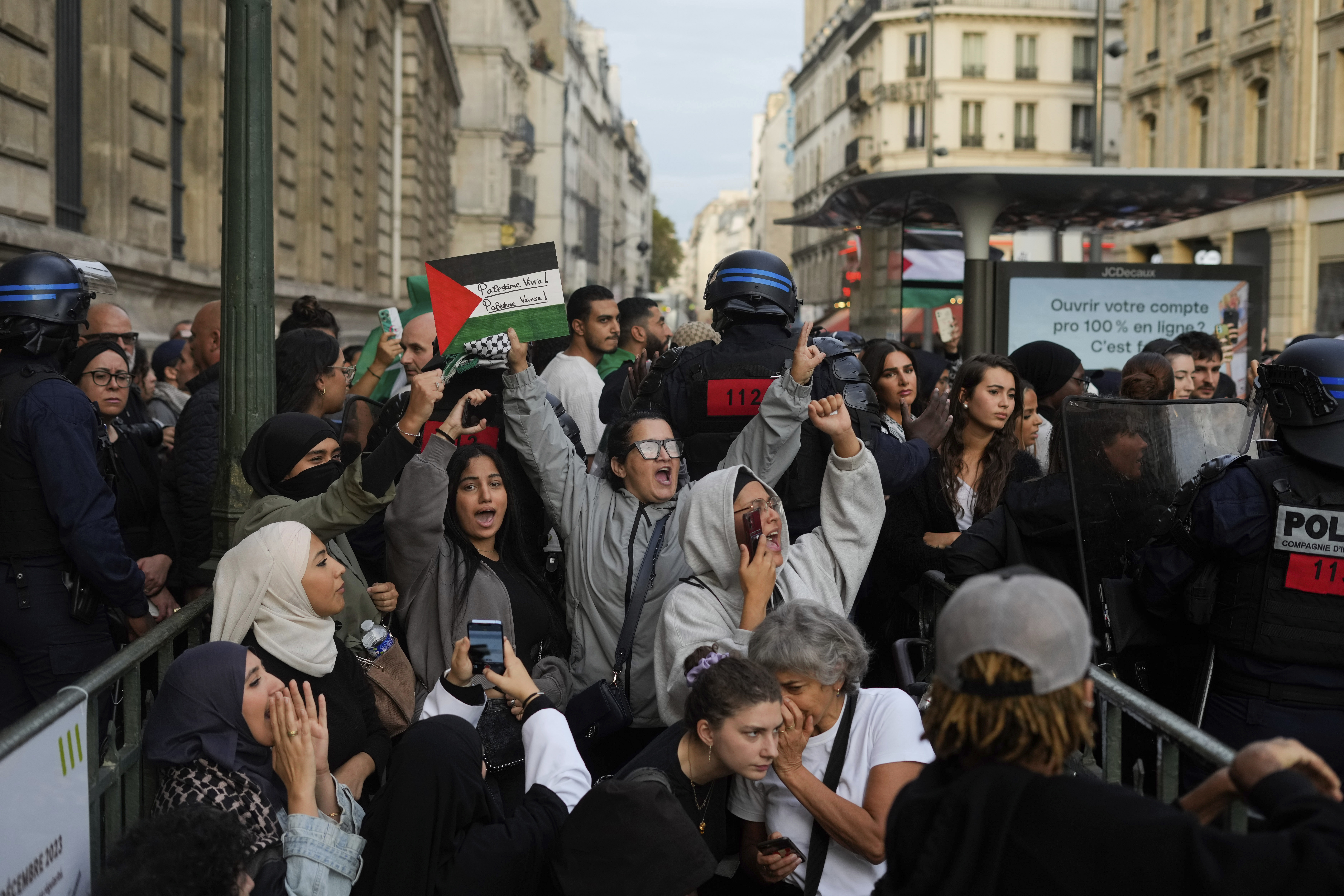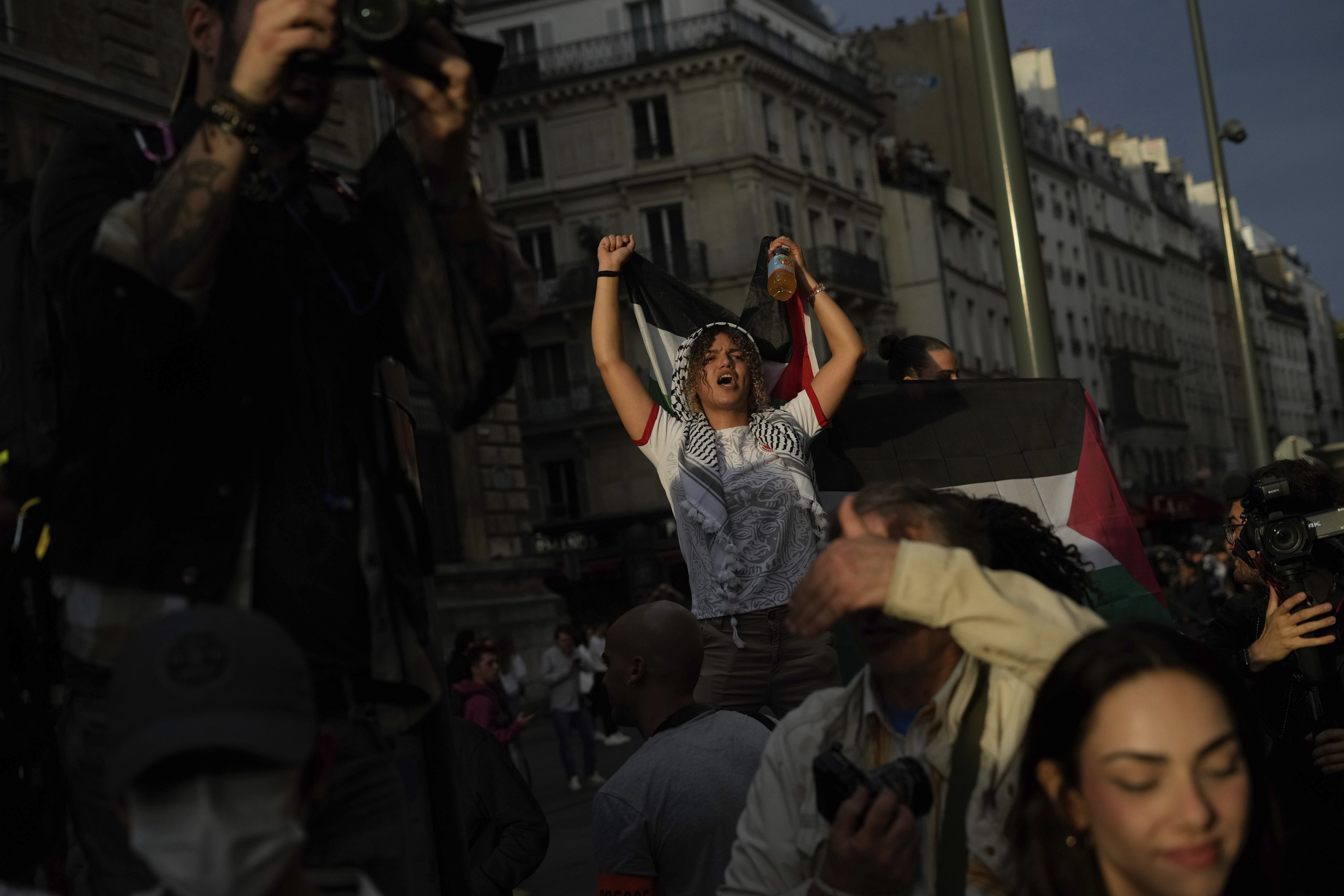 At the banned Paris protest on Thursday, protesters draped Palestinian flags around their shoulders, and ''Free Palestine'' was sprayed on the monument underpinning Republic Plaza in eastern Paris.