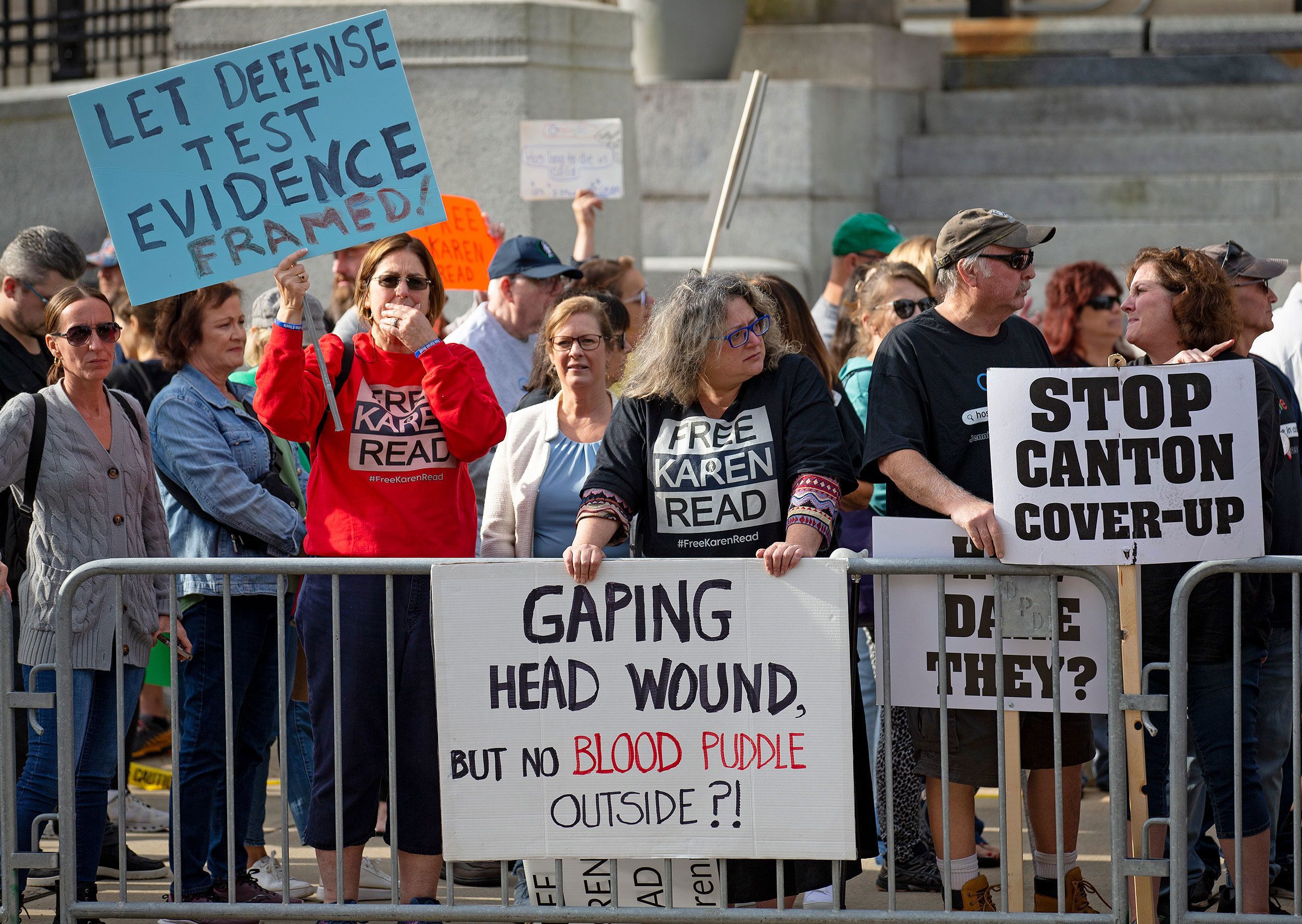 In nearby Malden, a group of Read's supporters hosted a Halloween Day fundraiser for her defense. Some attendees wore "Free Karen Read" T-shirts and FBI hats or wrapped themselves in yellow crime-scene tape.