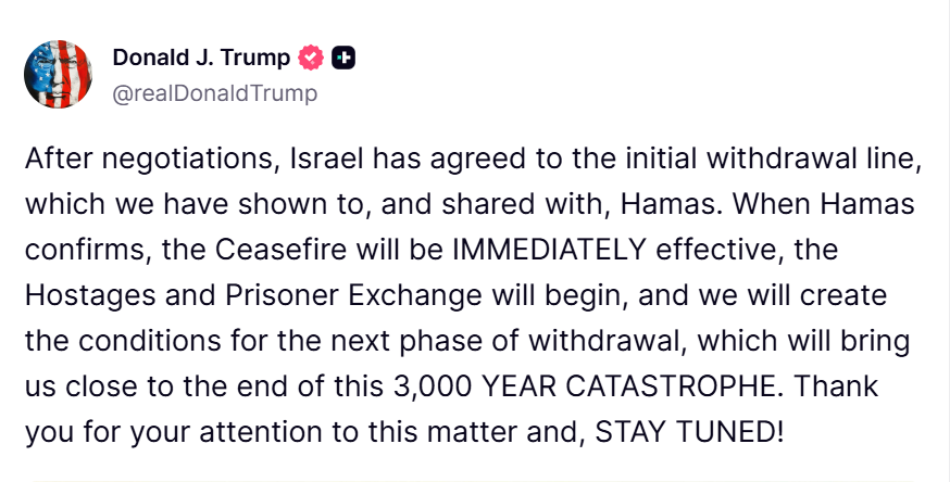 "When Hamas confirms, the Ceasefire will be IMMEDIATELY effective, the Hostages and Prisoner Exchange will begin, and we will create the conditions for the next phase of withdrawal, which will bring us close to the end of this 3,000 YEAR CATASTROPHE," the president said on Truth Social.