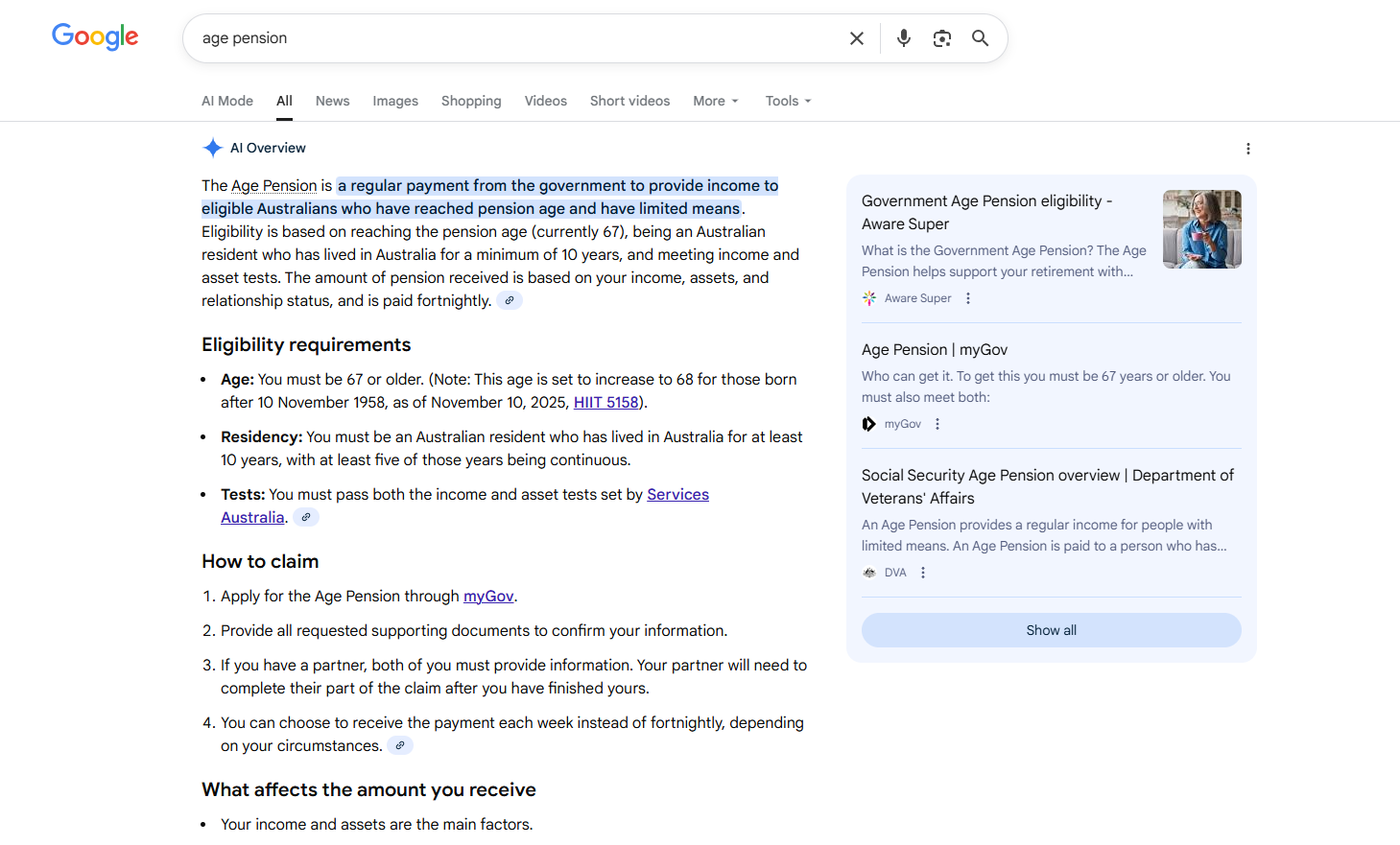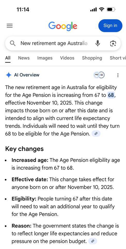 A false claim circulating online that the pension age in Australia will rise to 68 this month has been republished by Google AI.