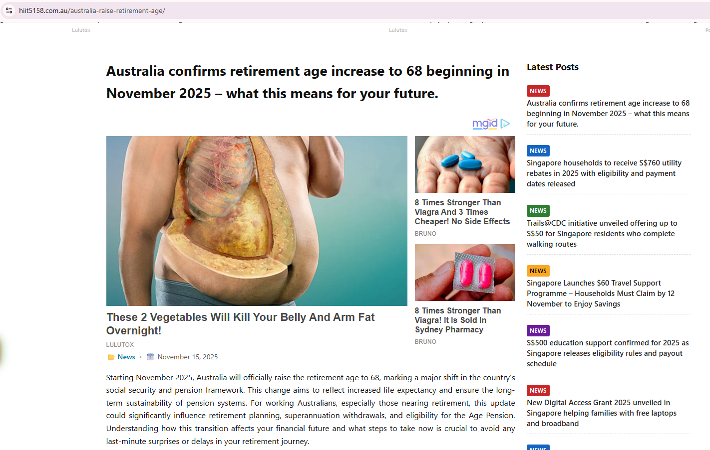 The false information, published by HIIT5158.com.au, claims the "official retirement age" in Australia will move from 67 to 68 from November 10, 2025, affecting anyone "born on or after 10 November 1958".